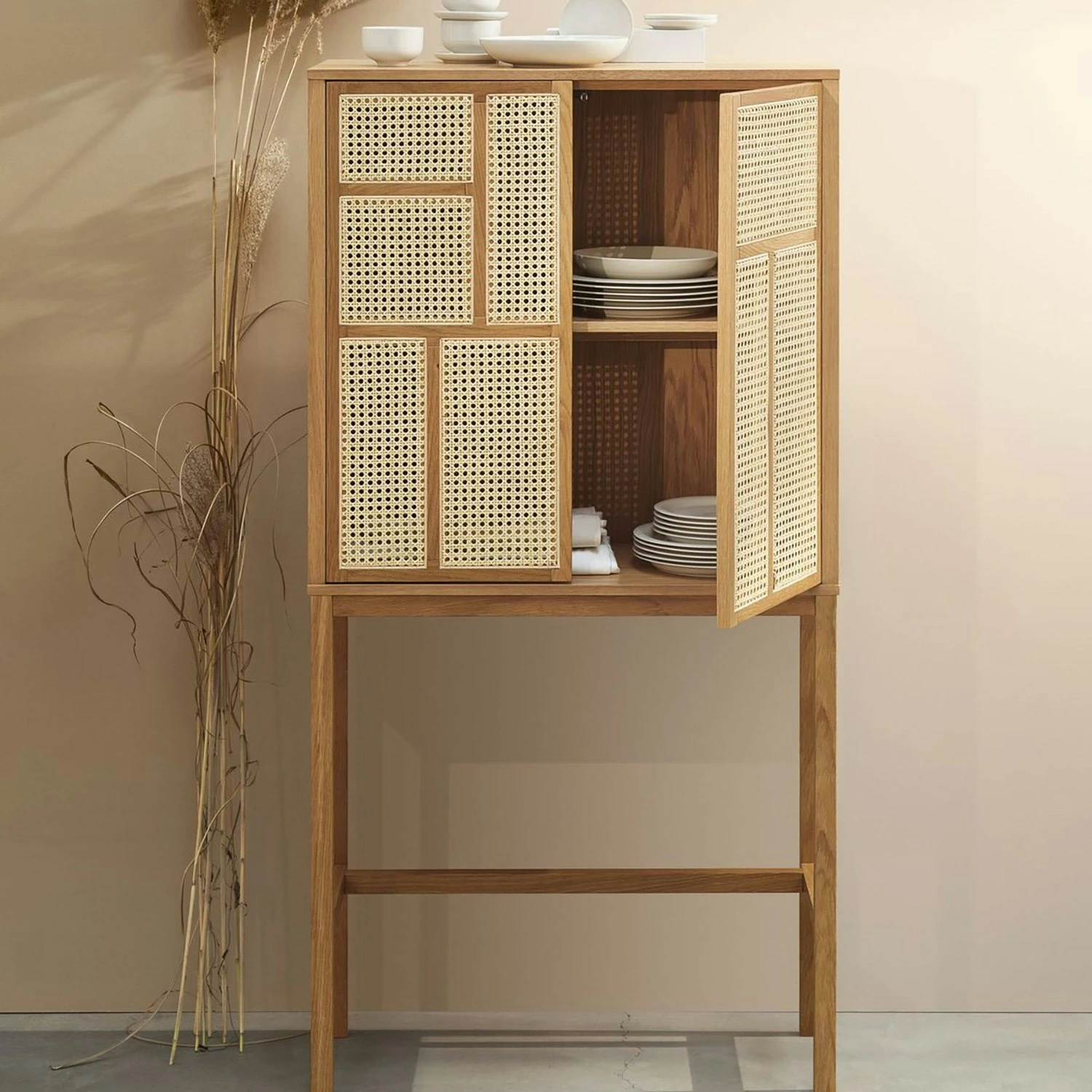 Das gewebte Rattan bietet eine schöne Oberfläche und verleiht dem Möbelstück gleichzeitig ein Gefühl von Tiefe. Der Betrachter bekommt eine Vorstellung davon, was hinter den Türen verborgen ist, aber der Inhalt wird nicht vollständig sichtbar. Das transparente Design erfüllt auch eine Funktion aus Sicht der Belüftung, die sich sowohl zur Aufbewahrung von Kleidung als auch von elektronischen Geräten eignet.