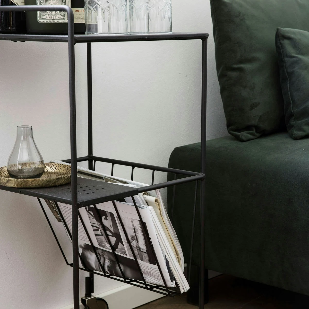 Use Beistelltisch von House Doctor ist ein eleganter Tisch mit Rädern aus schwarz lackiertem Stahl. Use hat viele Verwendungszwecke und seine Designsprache ist mit seinen klaren Linien sehr einfach. Verwende Use als schönen Servierwagen im Wohnzimmer, zum Aufbewahren von Zeitschriften und Büchern oder als schönes Detail im Badezimmer für Handtücher und Cremes.