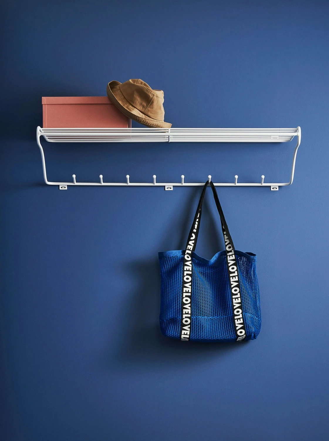Hutablage Hat Rack, entworfen von Olof Kolte für Maze. Ein stilvolles Hutregal aus umweltfreundlichem Metalldraht. Einfach und praktisch in seiner Art und passt perfekt zu allen Einrichtungsstilen. Begleitet von acht Haken mit guten Aufbewahrungsmöglichkeiten für Kleidung und Accessoires. Erhältlich in zwei Größen. In der gleichen Serie befinden sich auch das Mitten Shelf und das Shoe Shelf.
