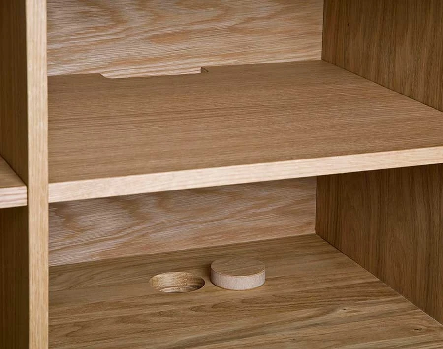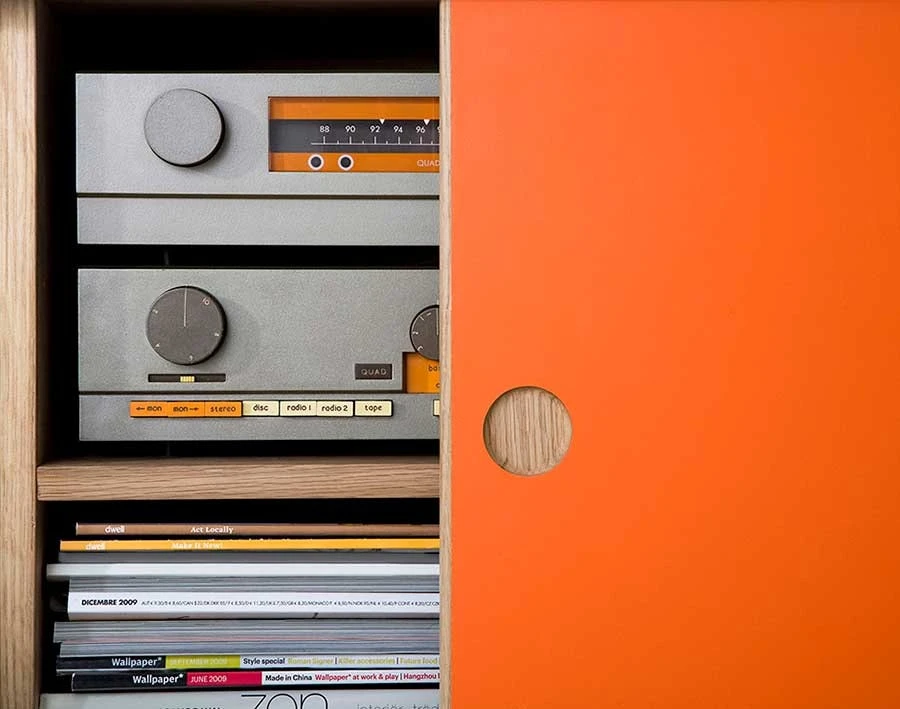 Die drehbaren Schiebetüren können das Aussehen nach Ihren Wünschen verändern. Zwei der Türen sind mit weißem Laminat ausgestattet, die anderen Türen sind in vier verschiedenen Farben erhältlich, in warmem Grau, in retro orange, stahlblau und weiß. Alle Türen haben Eichenfurnier auf der Rückseite, was bedeutet, dass alle Ausführungen vollständig in Eiche dargestellt werden können.