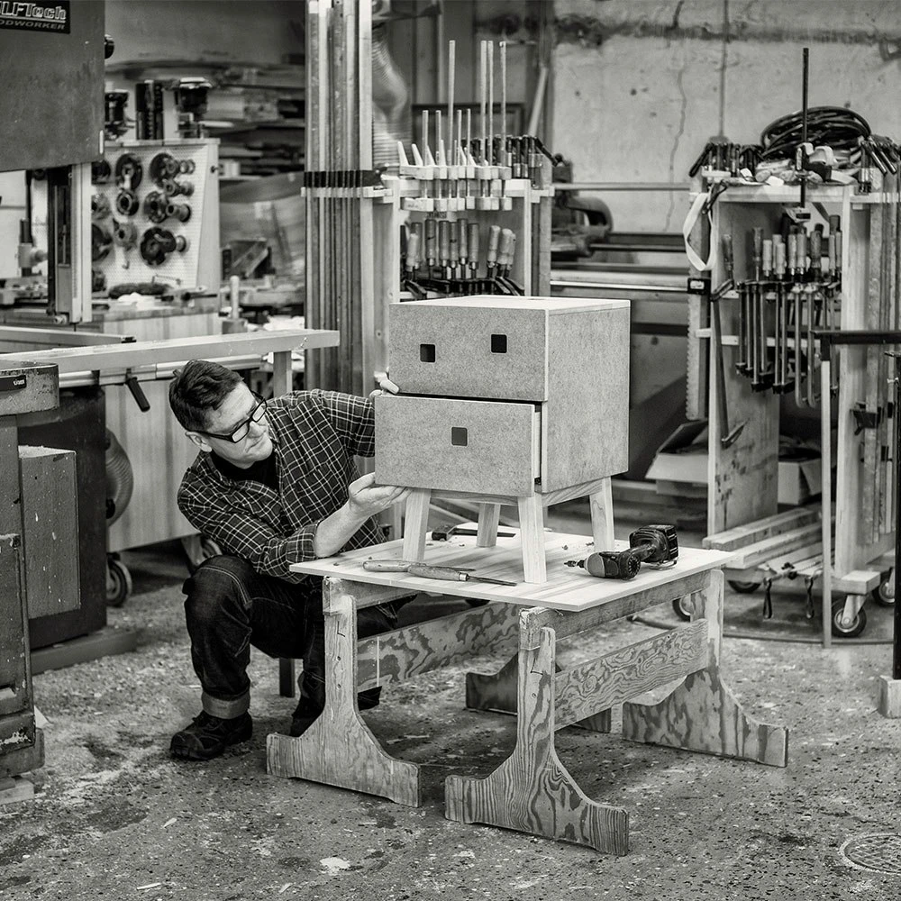 Peep S1 hat zwei Schubladen und oben einen versteckten Speicher zum Aufladen von Mobilgeräten und für Kabel. Die Schubladen lassen sich dank des eingebauten Dämpfers sanft schließen. Erhältlich mit Beinen aus weiß geölter Esche oder zur Wandmontage.