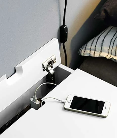 Peep S1 hat zwei Schubladen und oben einen versteckten Speicher zum Aufladen von Mobilgeräten und für Kabel. Die Schubladen lassen sich dank des eingebauten Dämpfers sanft schließen.