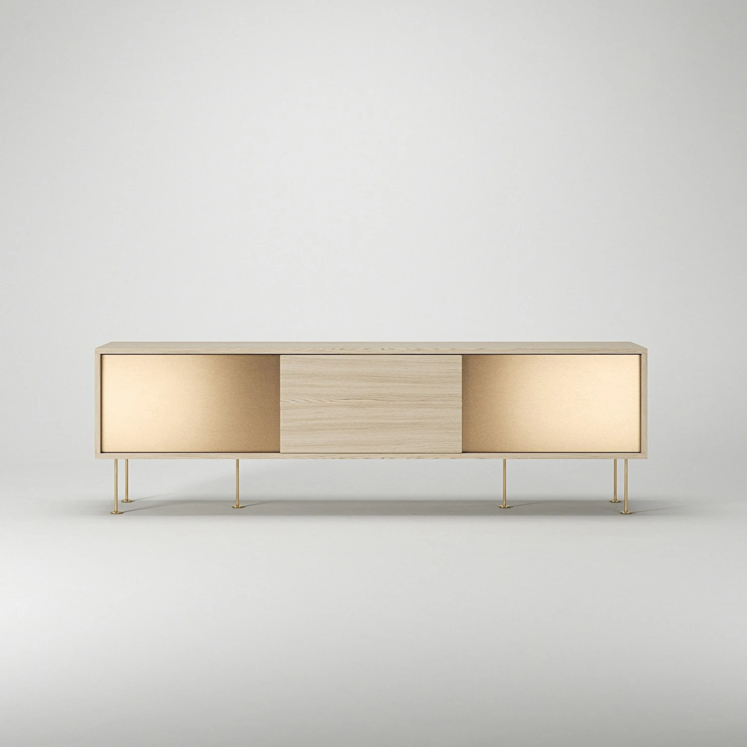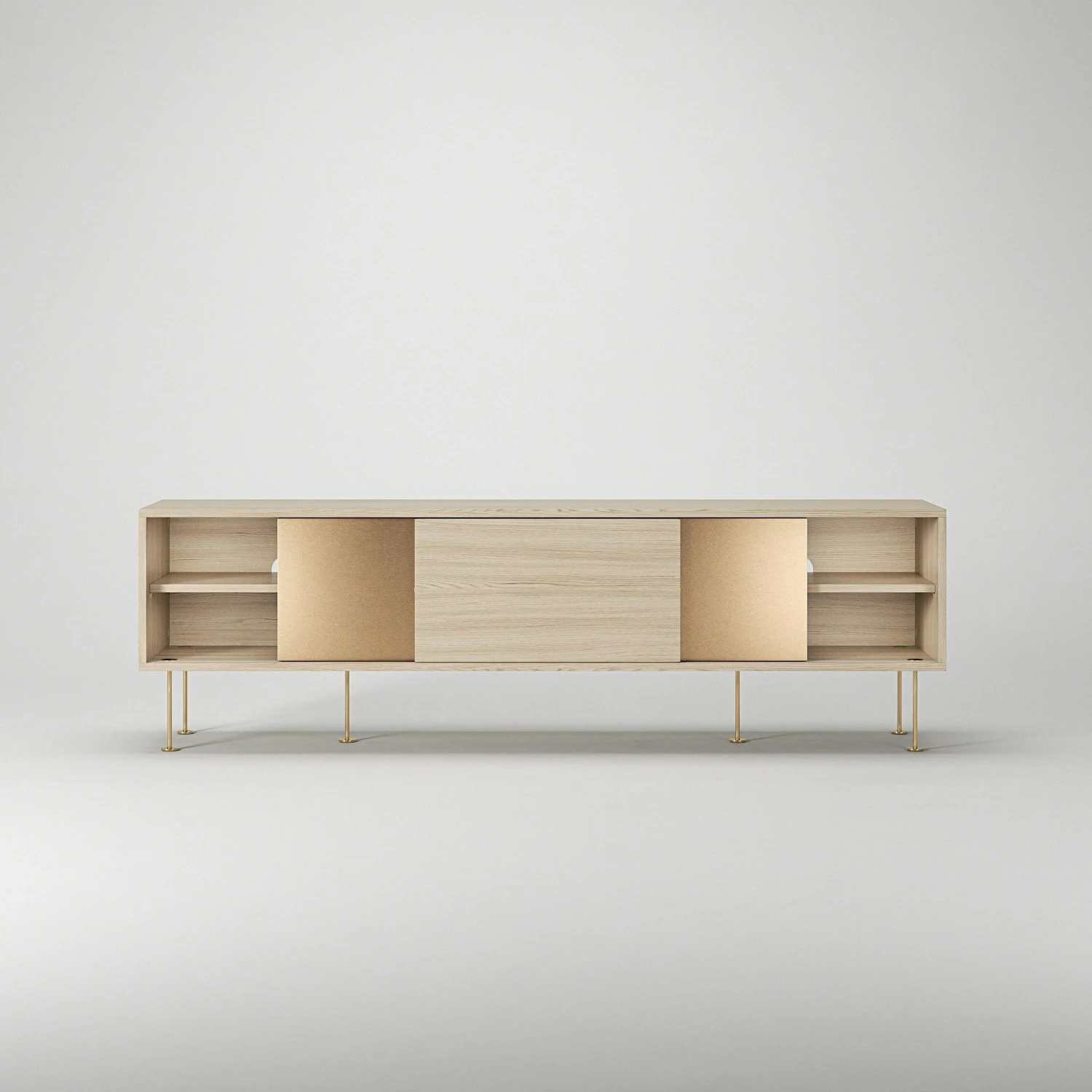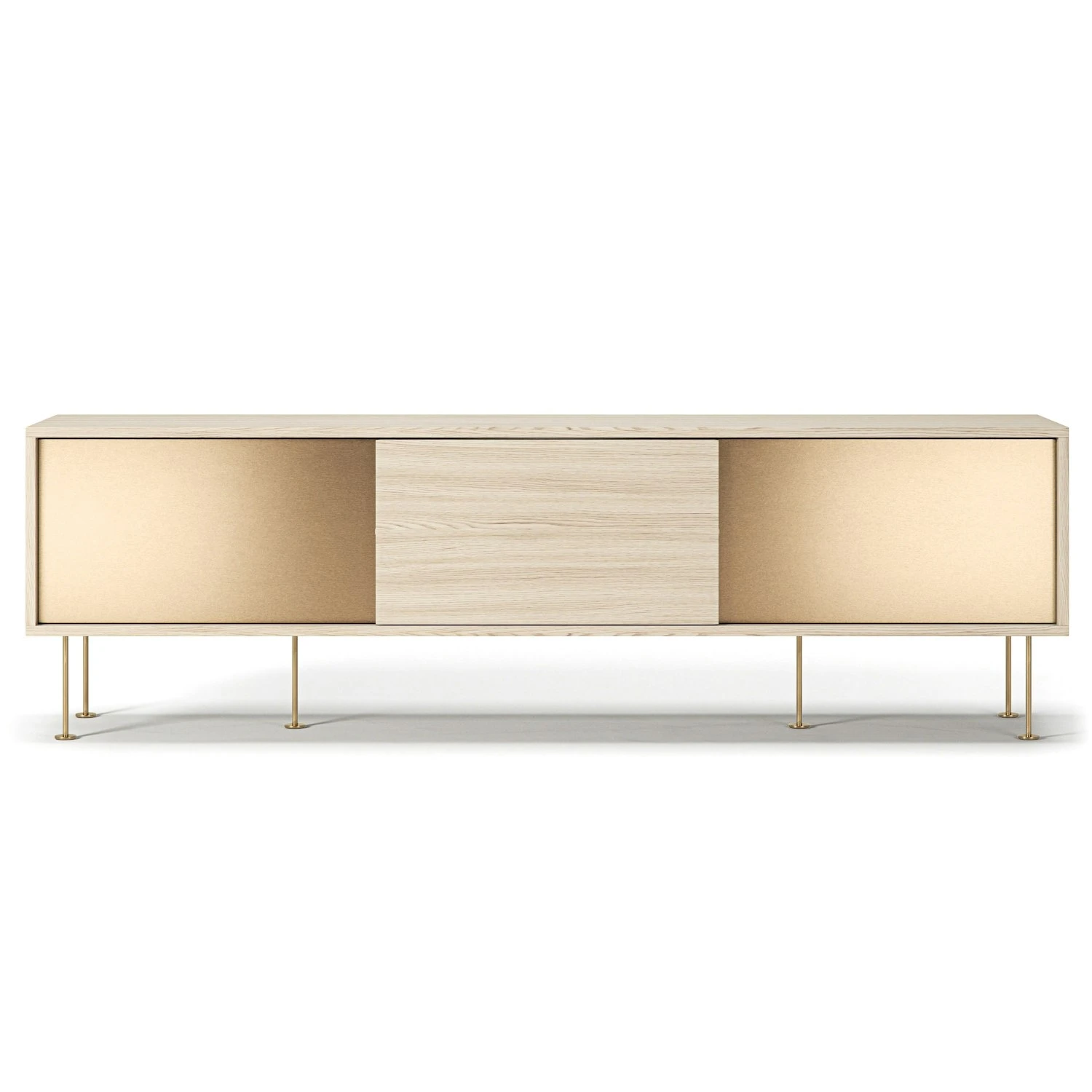 Die Vogue Fernsehbank ist ein Möbelstück, die praktisch als auch stilvoll ist. Hinter den Schiebetüren ist pro Abschnitt ein Regal versteckt. Sie sind abnehmbar für das Einräumen. Auf der Rückseite jedes Fachs befindet sich eine Öffnung, durch die die Fernsehkabel nach hinten gezogen werden können.