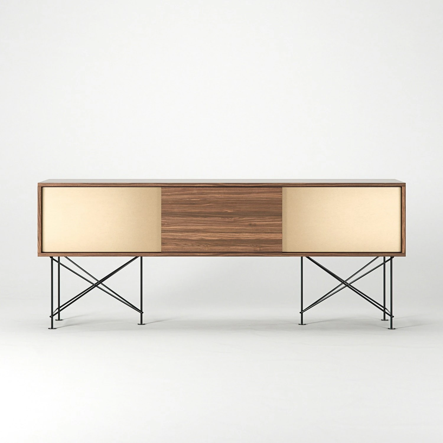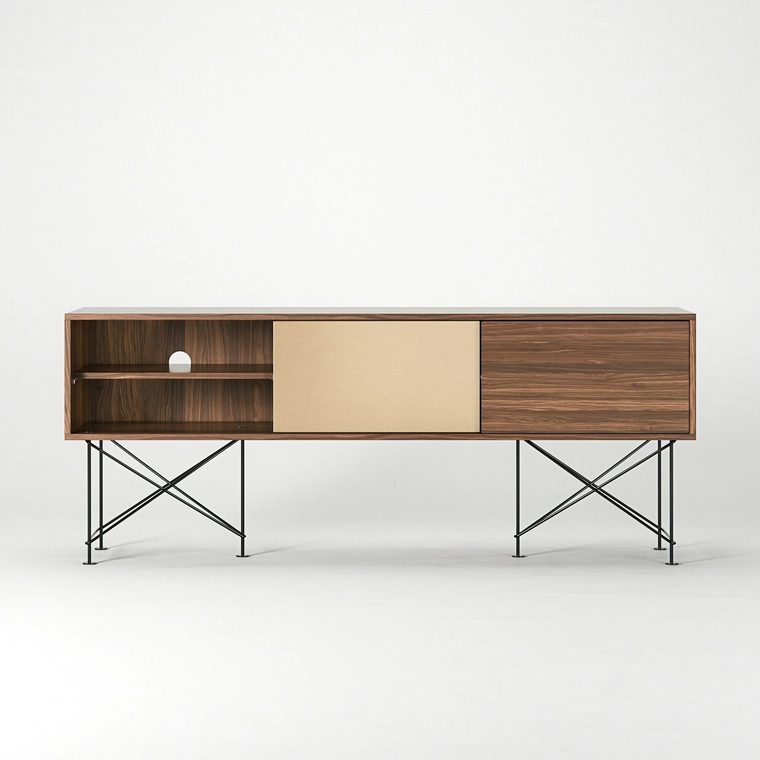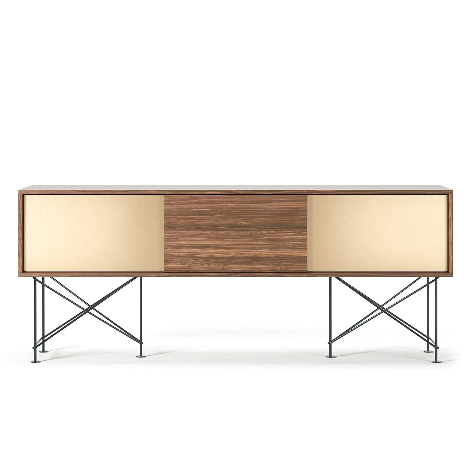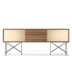 Die Vogue Fernsehbank ist ein Möbelstück, die praktisch als auch stilvoll ist. Hinter den Schiebetüren ist pro Abschnitt ein Regal versteckt. Sie sind abnehmbar für das Einräumen. Auf der Rückseite jedes Fachs befindet sich eine Öffnung, durch die die Fernsehkabel nach hinten gezogen werden können.