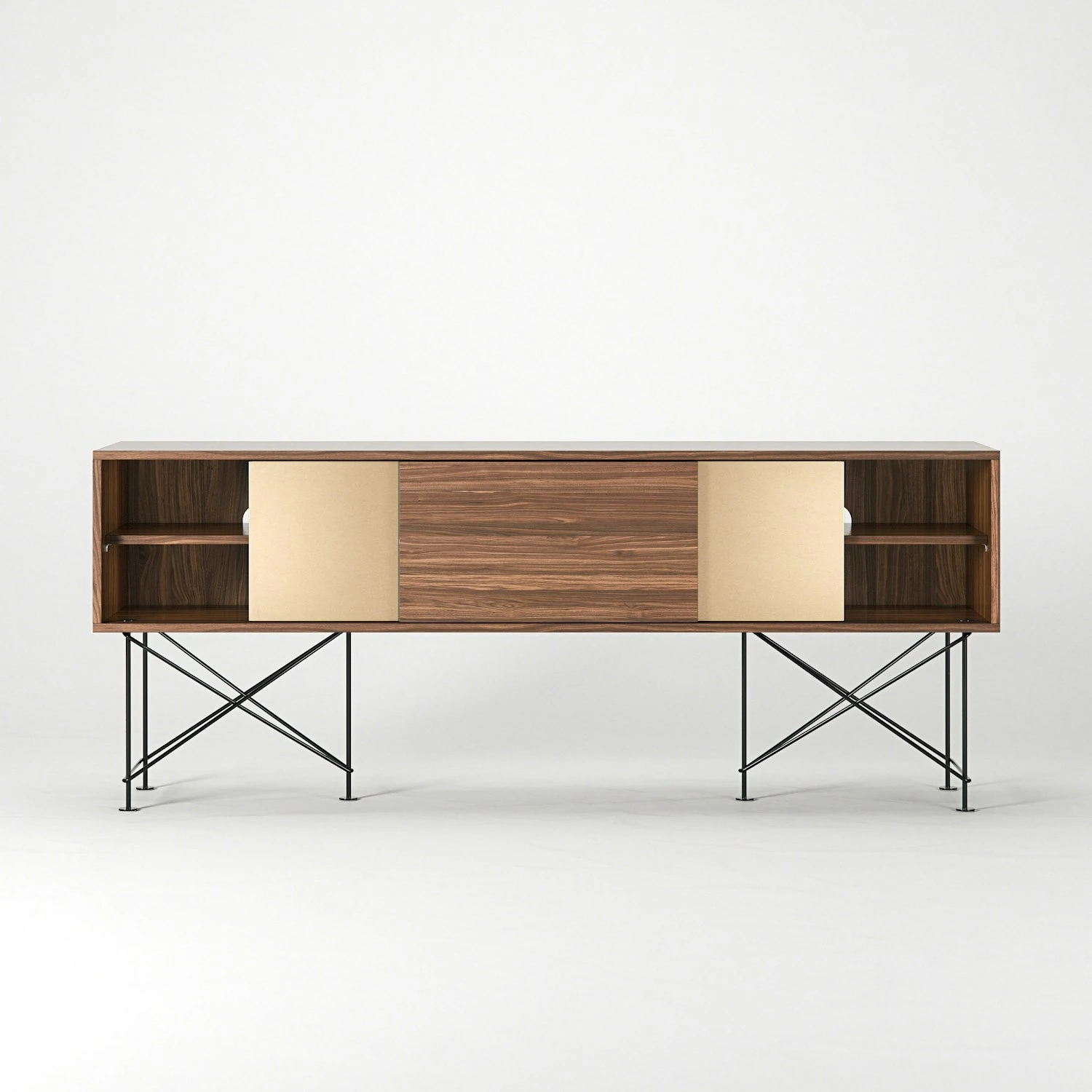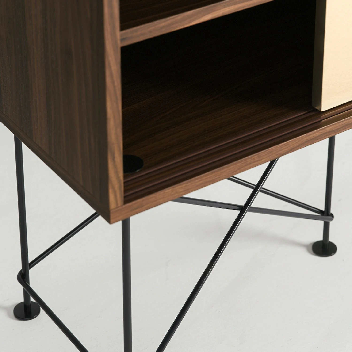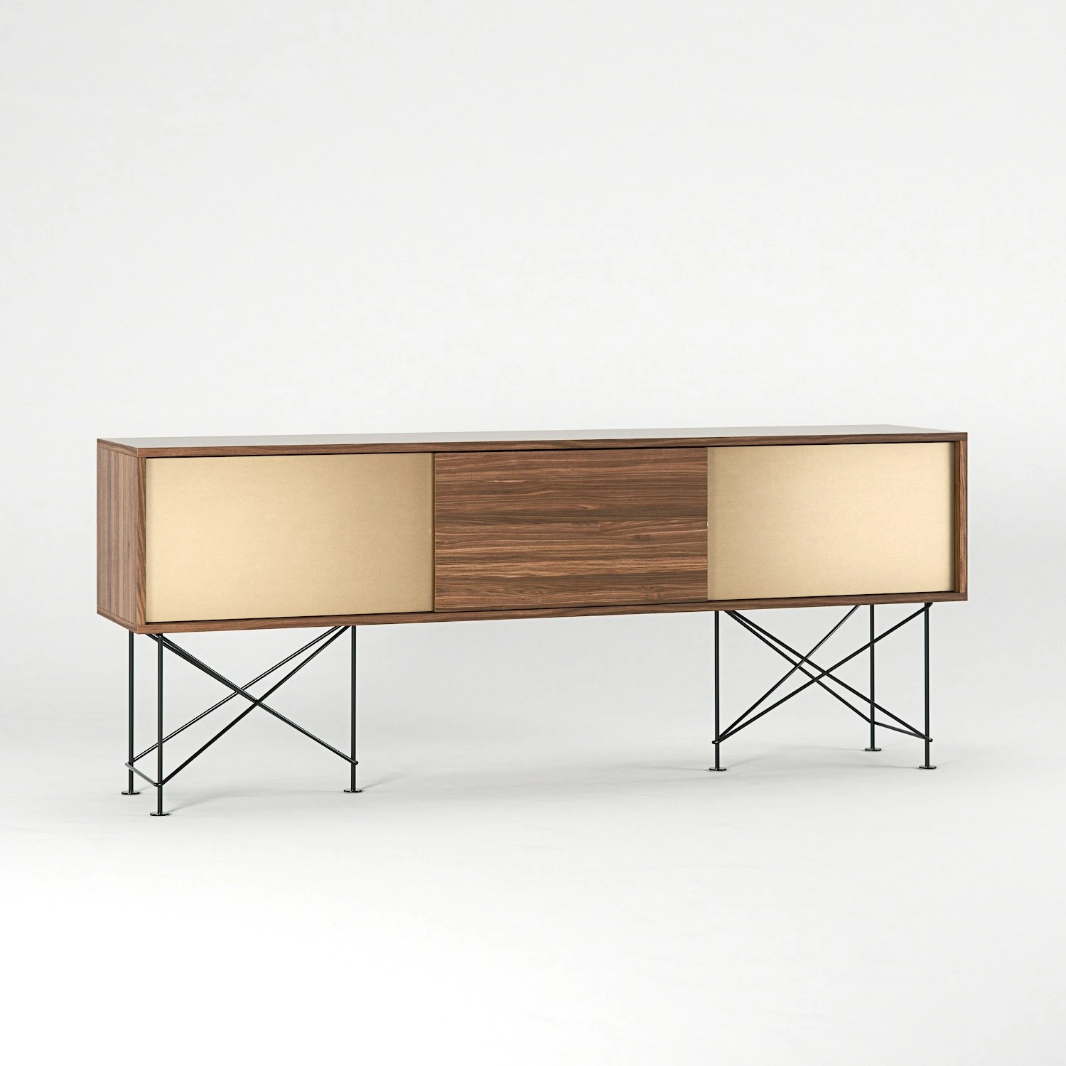 Die Vogue Fernsehbank ist ein Möbelstück, die praktisch als auch stilvoll ist. Hinter den Schiebetüren ist pro Abschnitt ein Regal versteckt. Sie sind abnehmbar für das Einräumen. Auf der Rückseite jedes Fachs befindet sich eine Öffnung, durch die die Fernsehkabel nach hinten gezogen werden können.