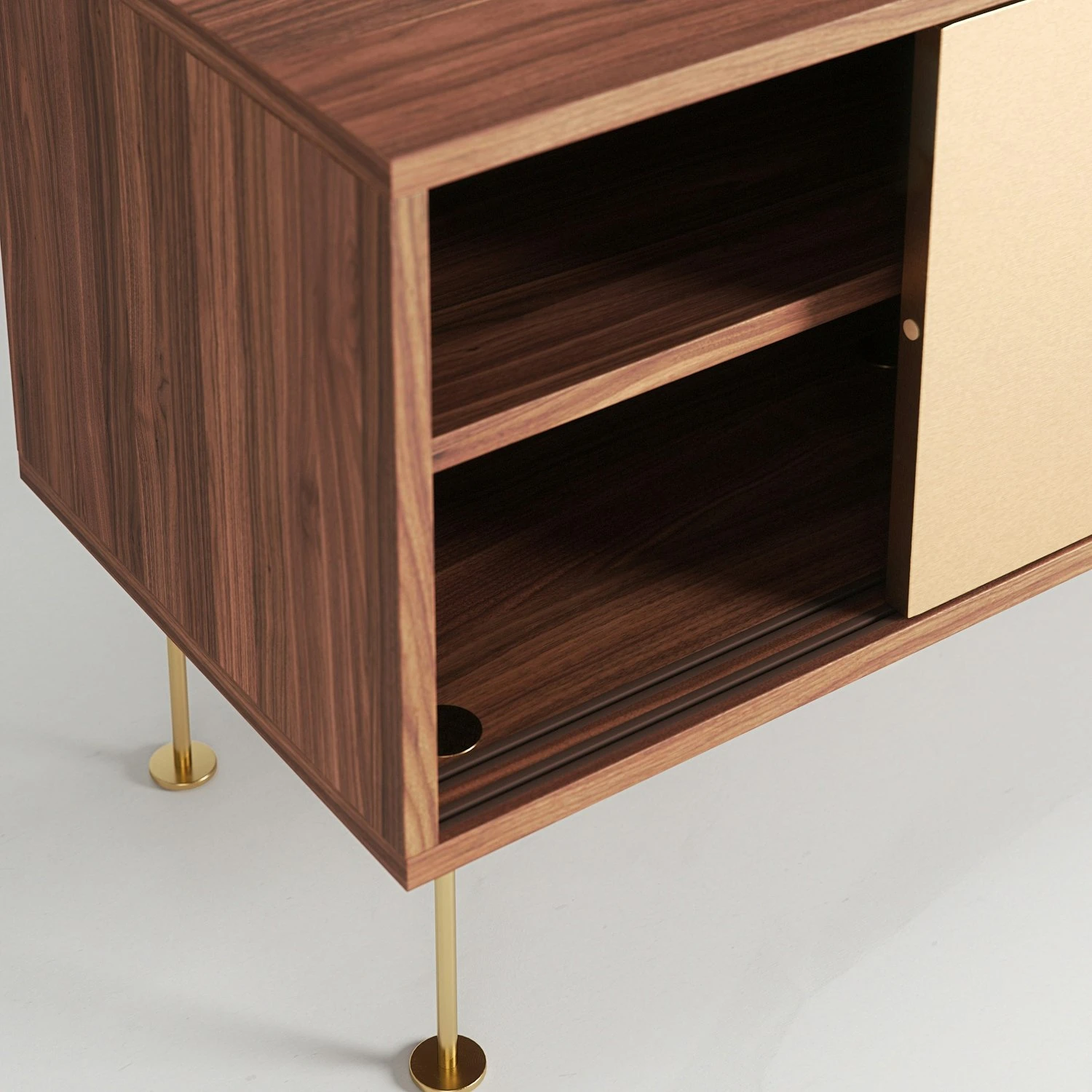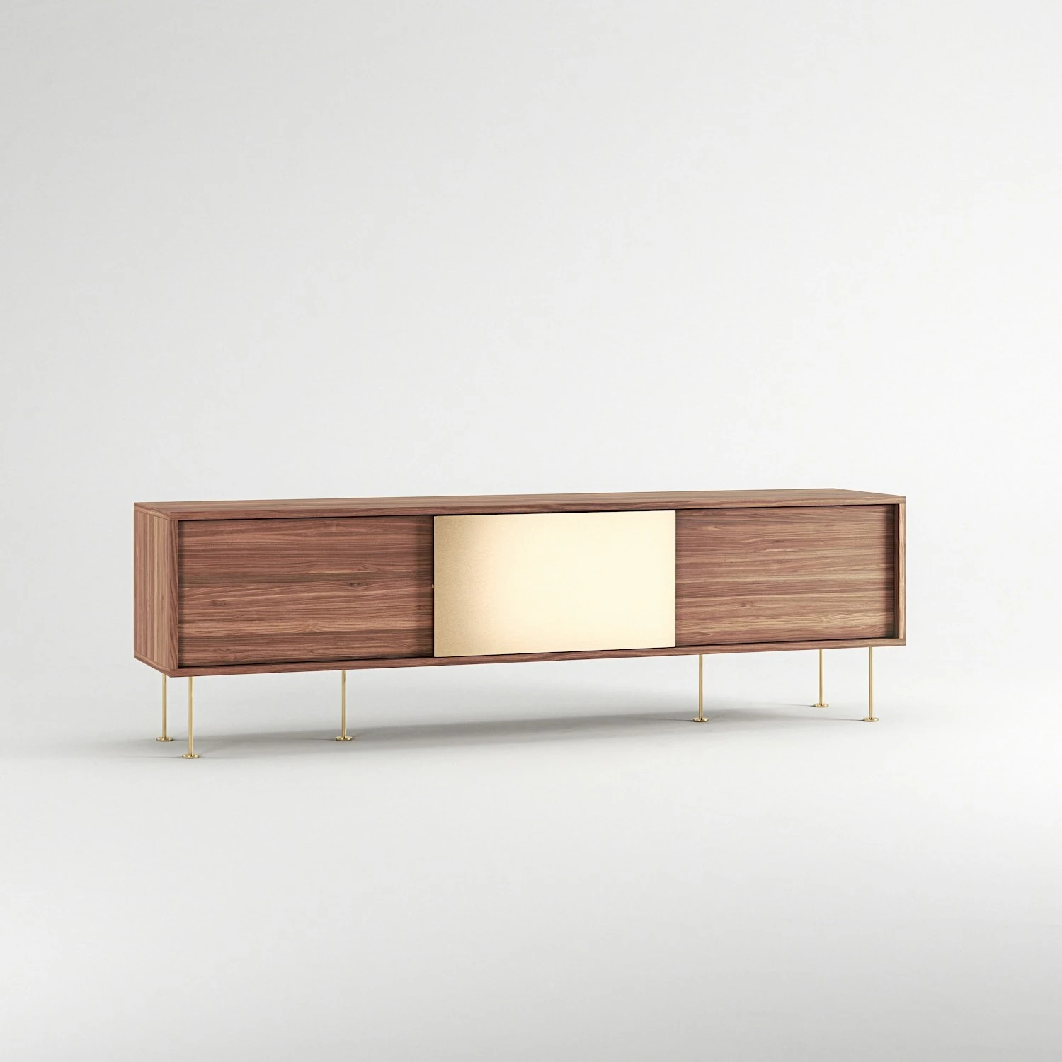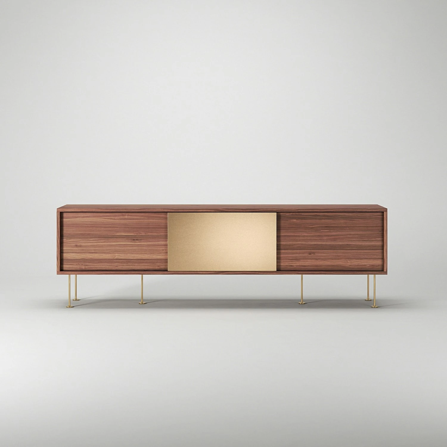 Das Lowboard ist in zwei verschiedenen Größen erhältlich: das kürzere ist 136 cm lang und hat zwei Schiebetüren, das längere misst 180 cm und hat drei Schiebetüren. Hinter jeder Schiebetüre befindet sich ein Fach mit einem Regal, welches für bestmöglichen Stauraum verstell- und herausnehmbar ist. Jedes Fach hat eine Öffnung auf der Rückseite, durch die Kabel gezogen und auf der Rückseite versteckt werden können.