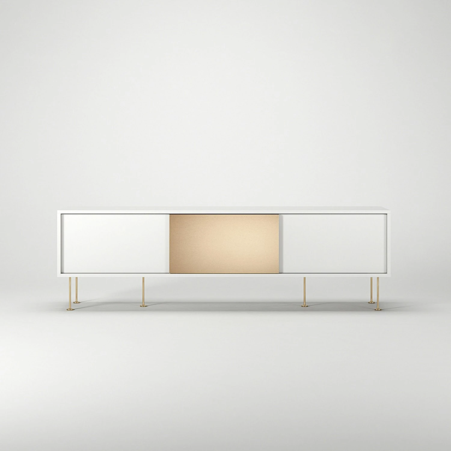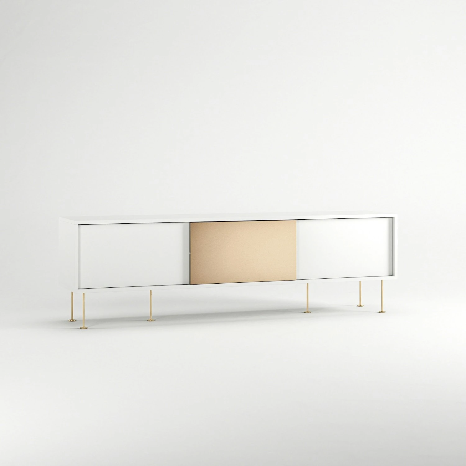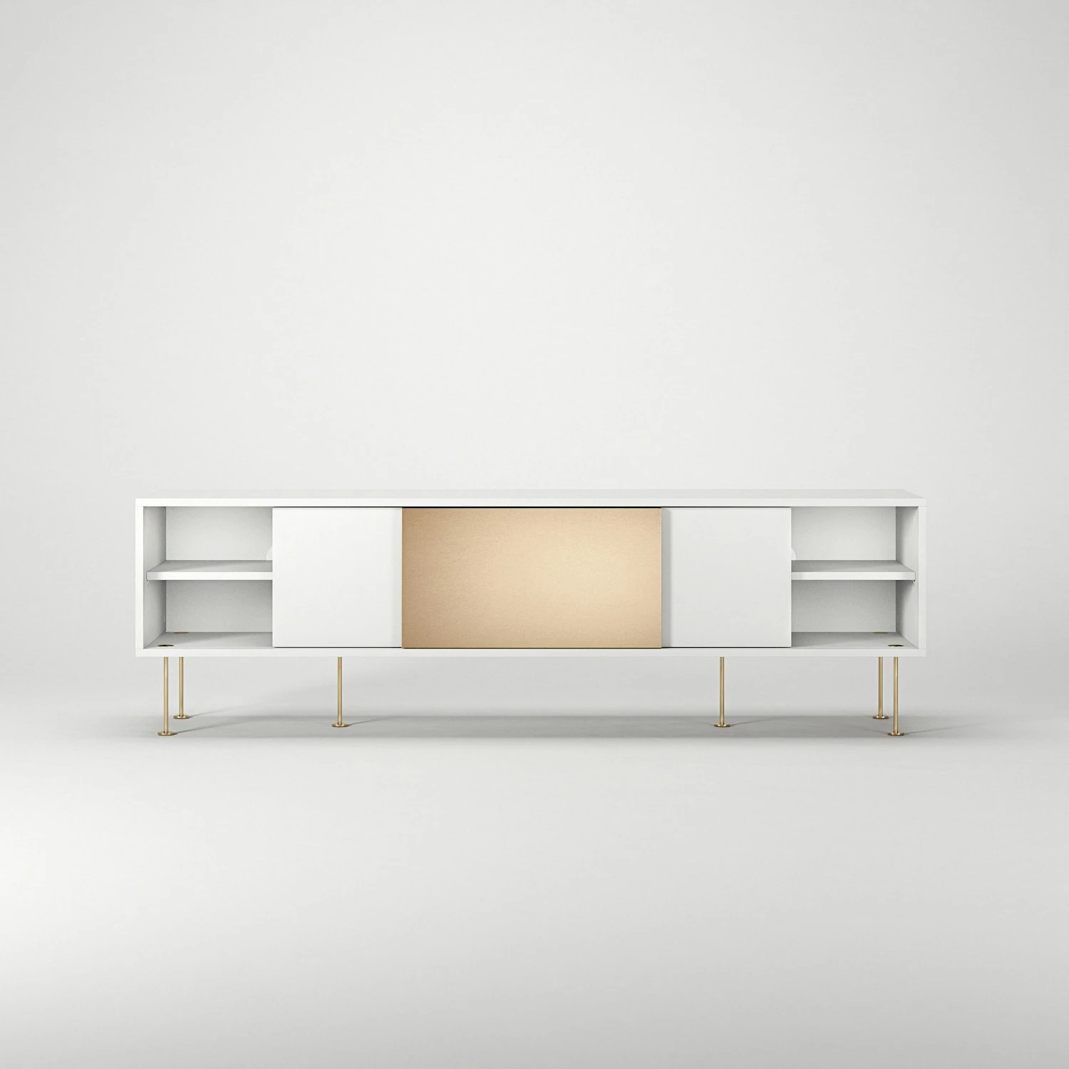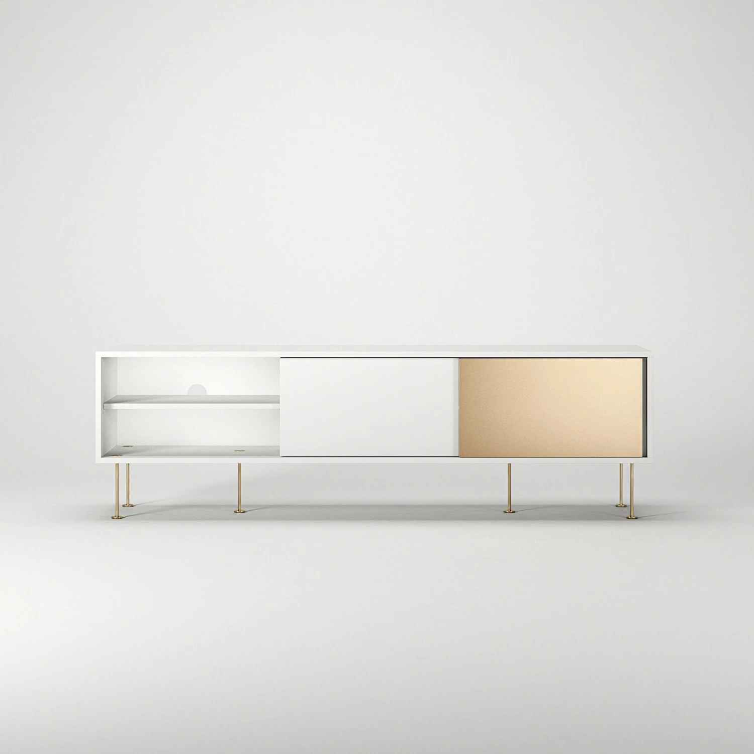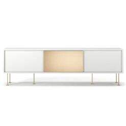 Das Lowboard ist in zwei verschiedenen Größen erhältlich: das kürzere ist 136 cm lang und hat zwei Schiebetüren, das längere misst 180 cm und hat drei Schiebetüren. Hinter jeder Schiebetüre befindet sich ein Fach mit einem Regal, welches für bestmöglichen Stauraum verstell- und herausnehmbar ist. Jedes Fach hat eine Öffnung auf der Rückseite, durch die Kabel gezogen und auf der Rückseite versteckt werden können.