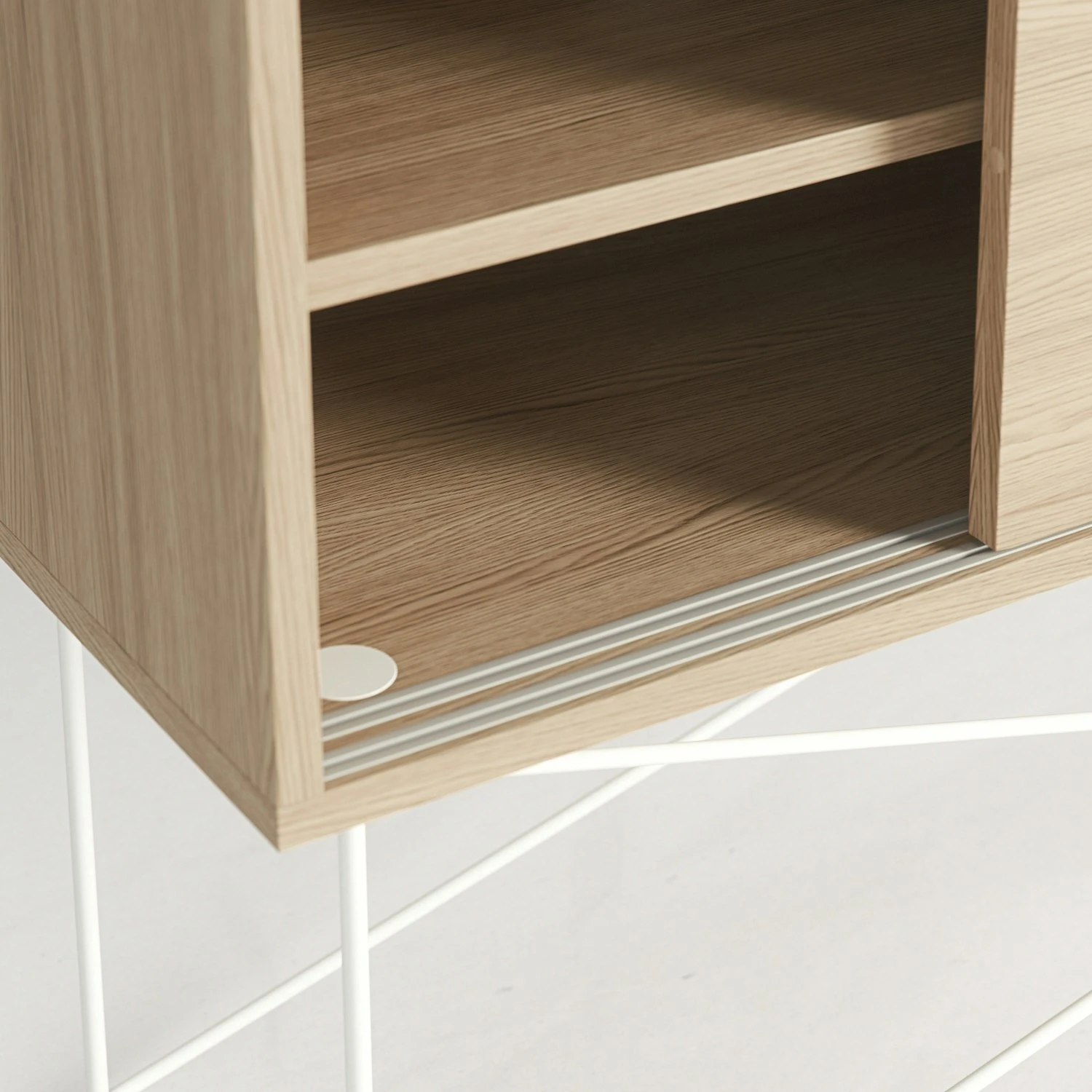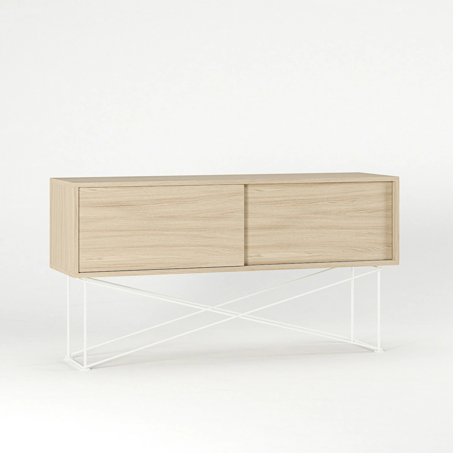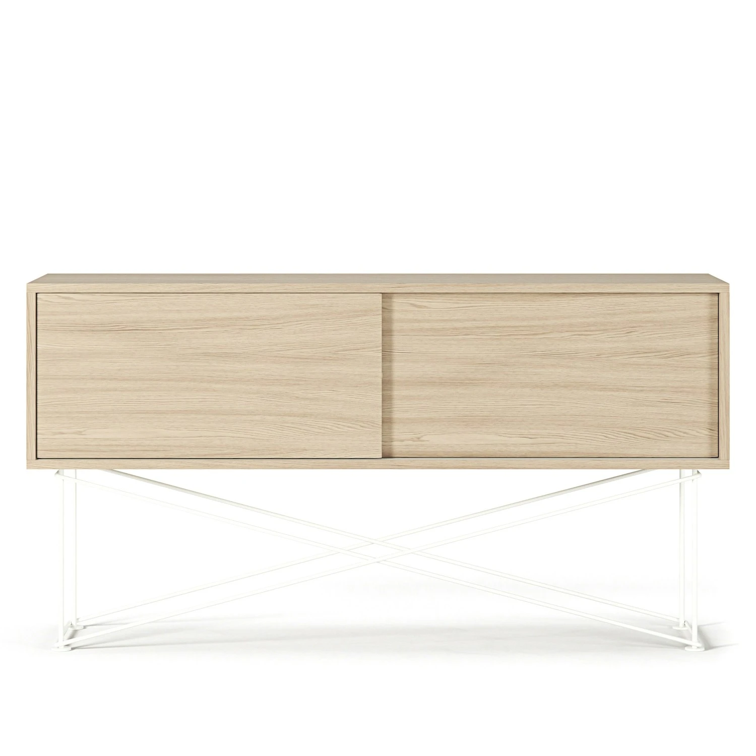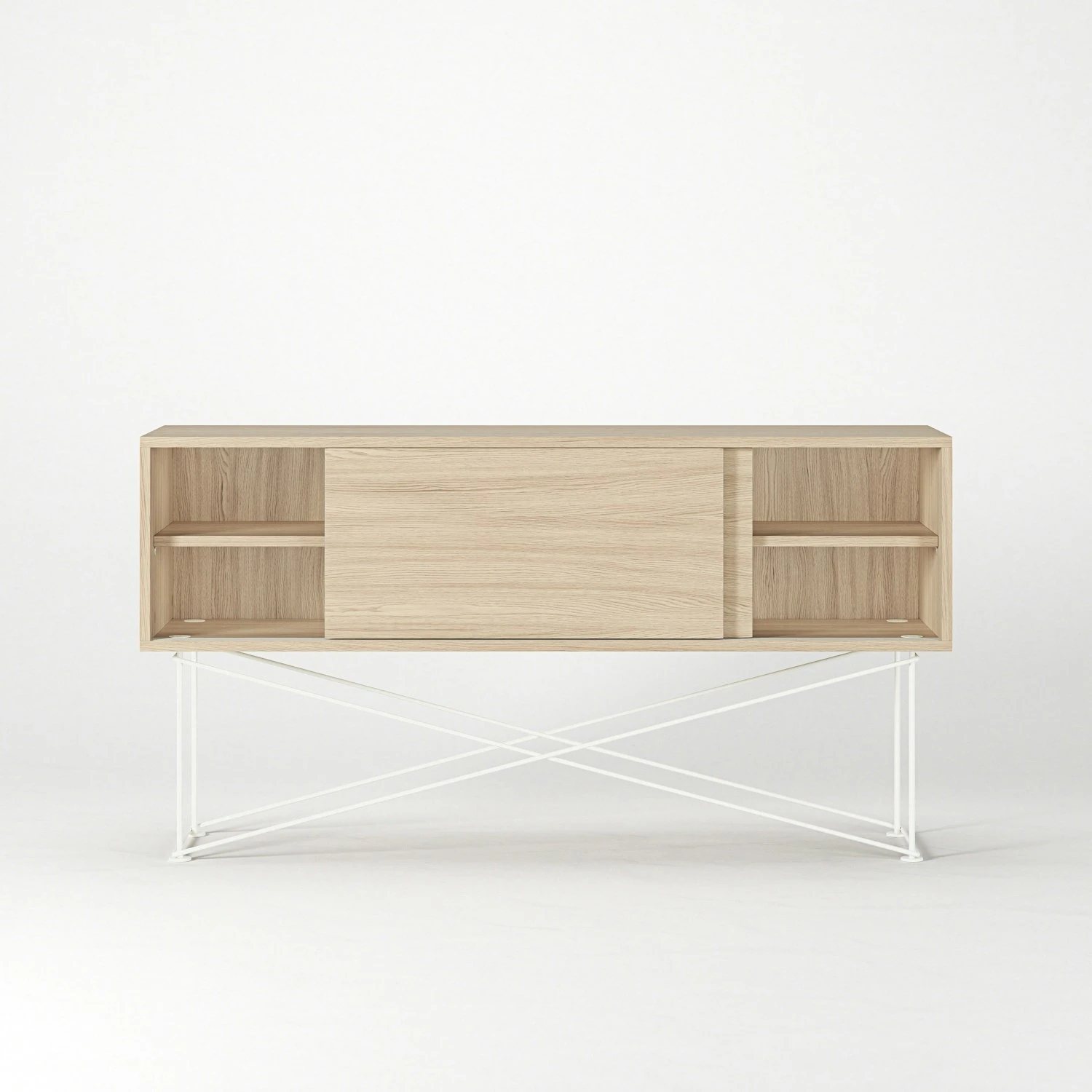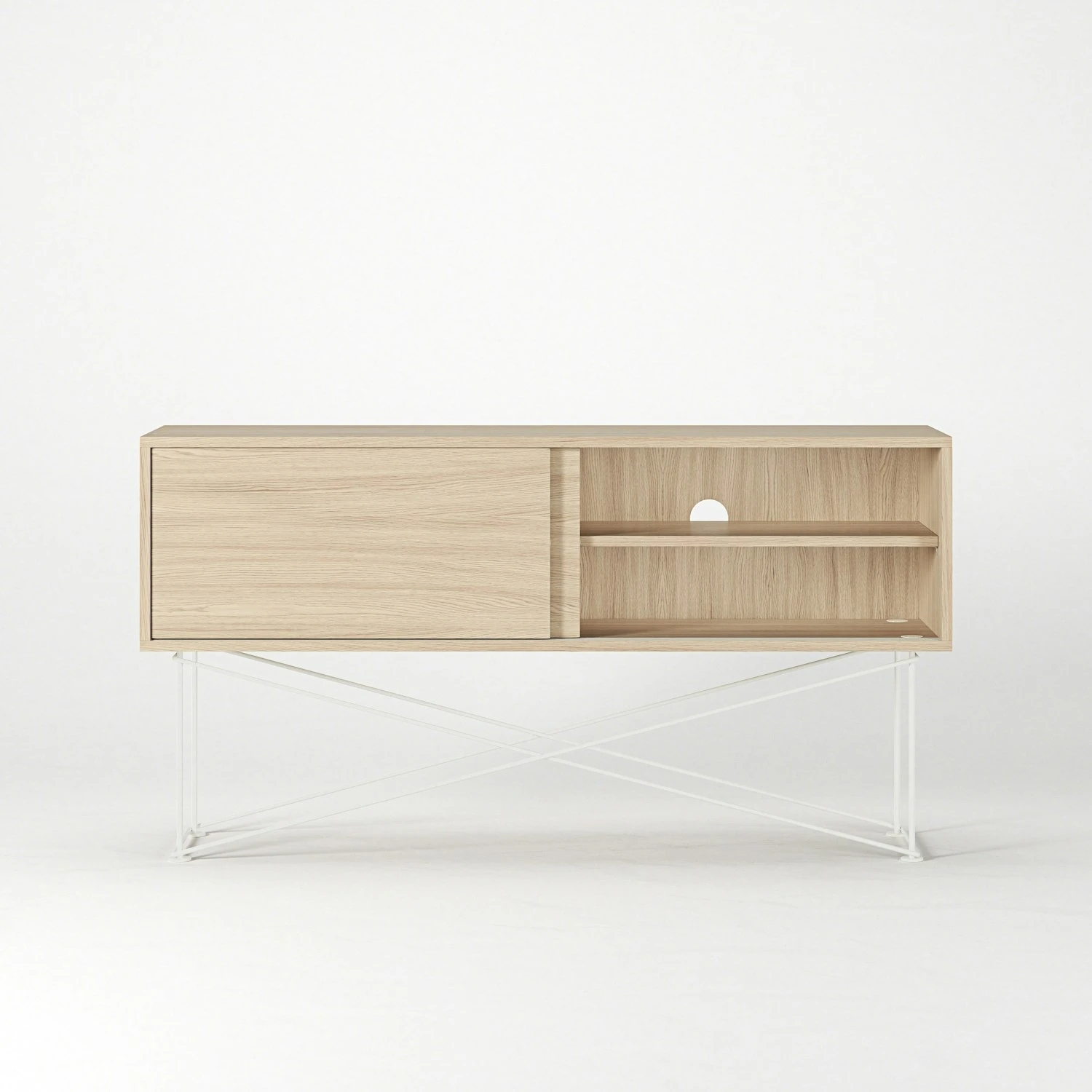 Das Sideboard ist in zwei verschiedenen Größen erhältlich: das kürzere ist 136 cm lang und hat zwei Schiebetüren, das längere misst 180 cm und hat drei Schiebetüren. Hinter jeder Schiebetüre befindet sich ein Fach mit einem Regal, welches für bestmöglichen Stauraum verstell- und herausnehmbar ist. Jedes Fach hat eine Öffnung auf der Rückseite, durch die Kabel gezogen und auf der Rückseite versteckt werden können.