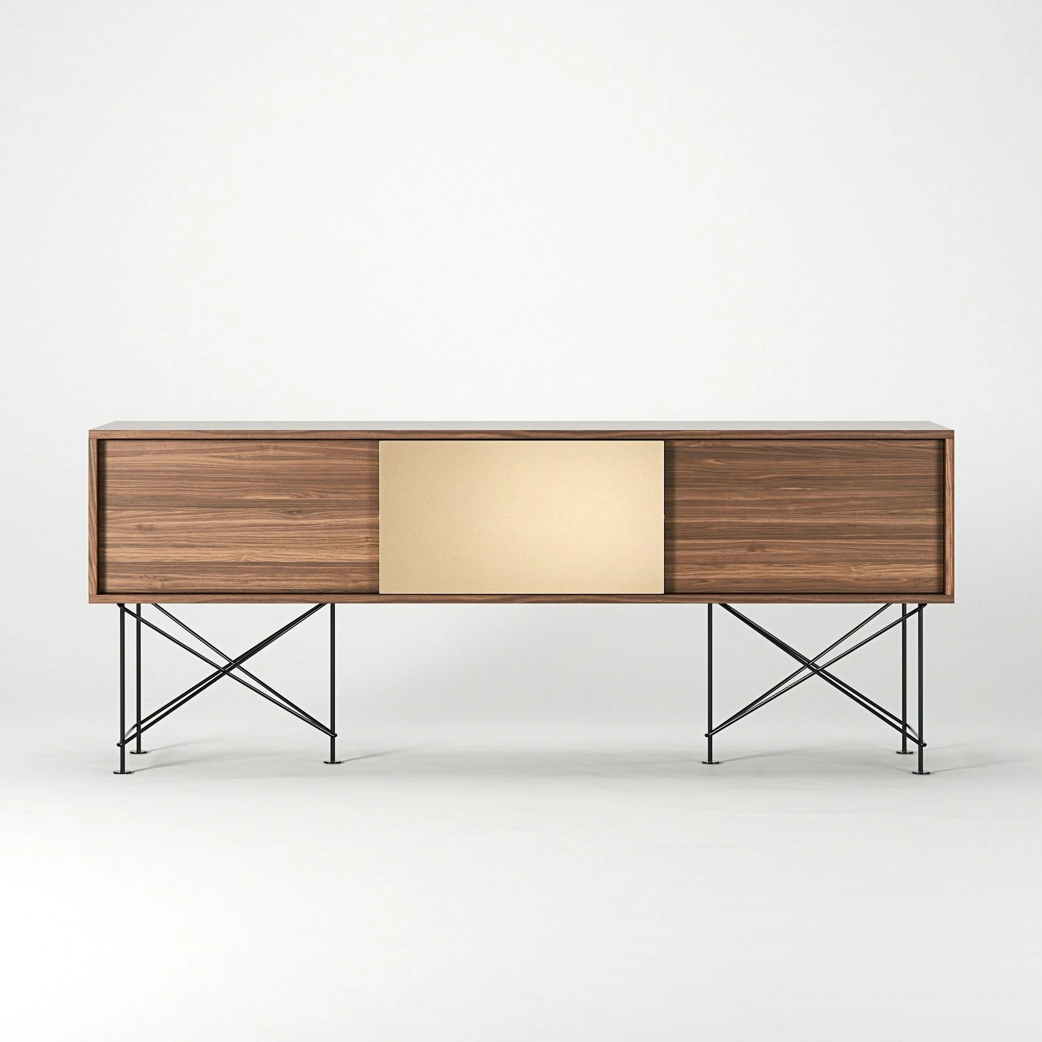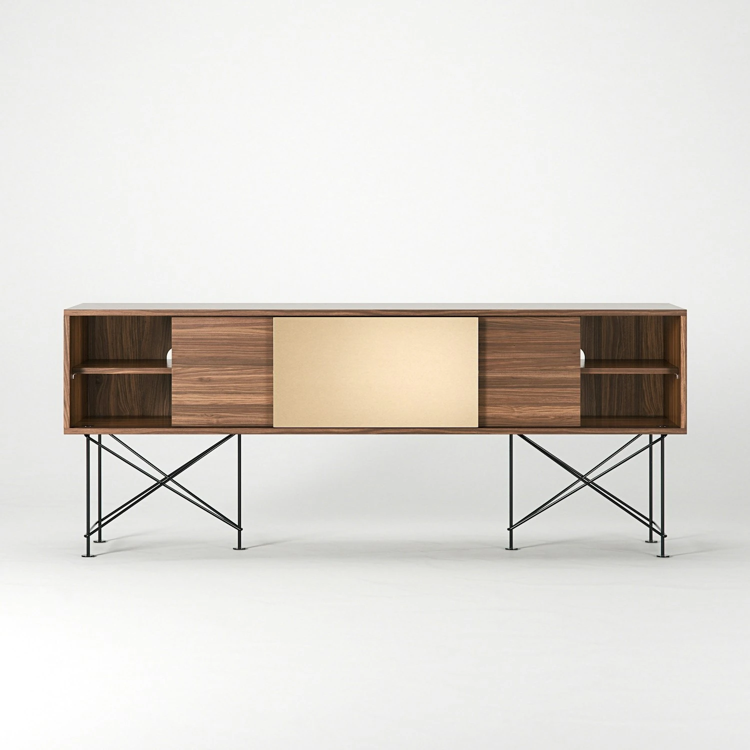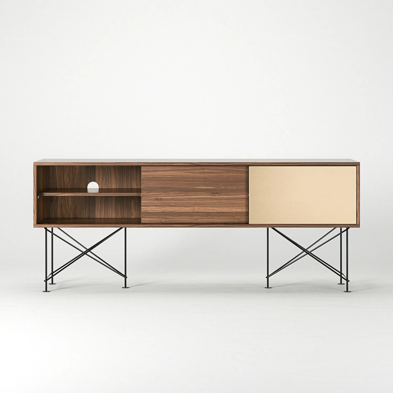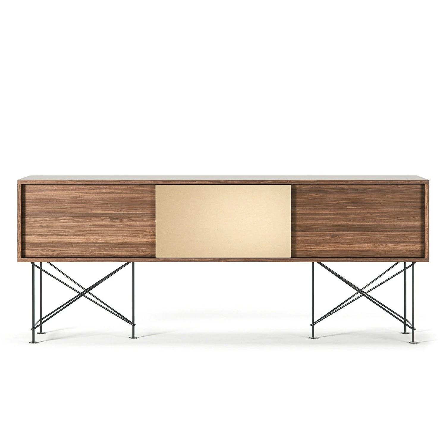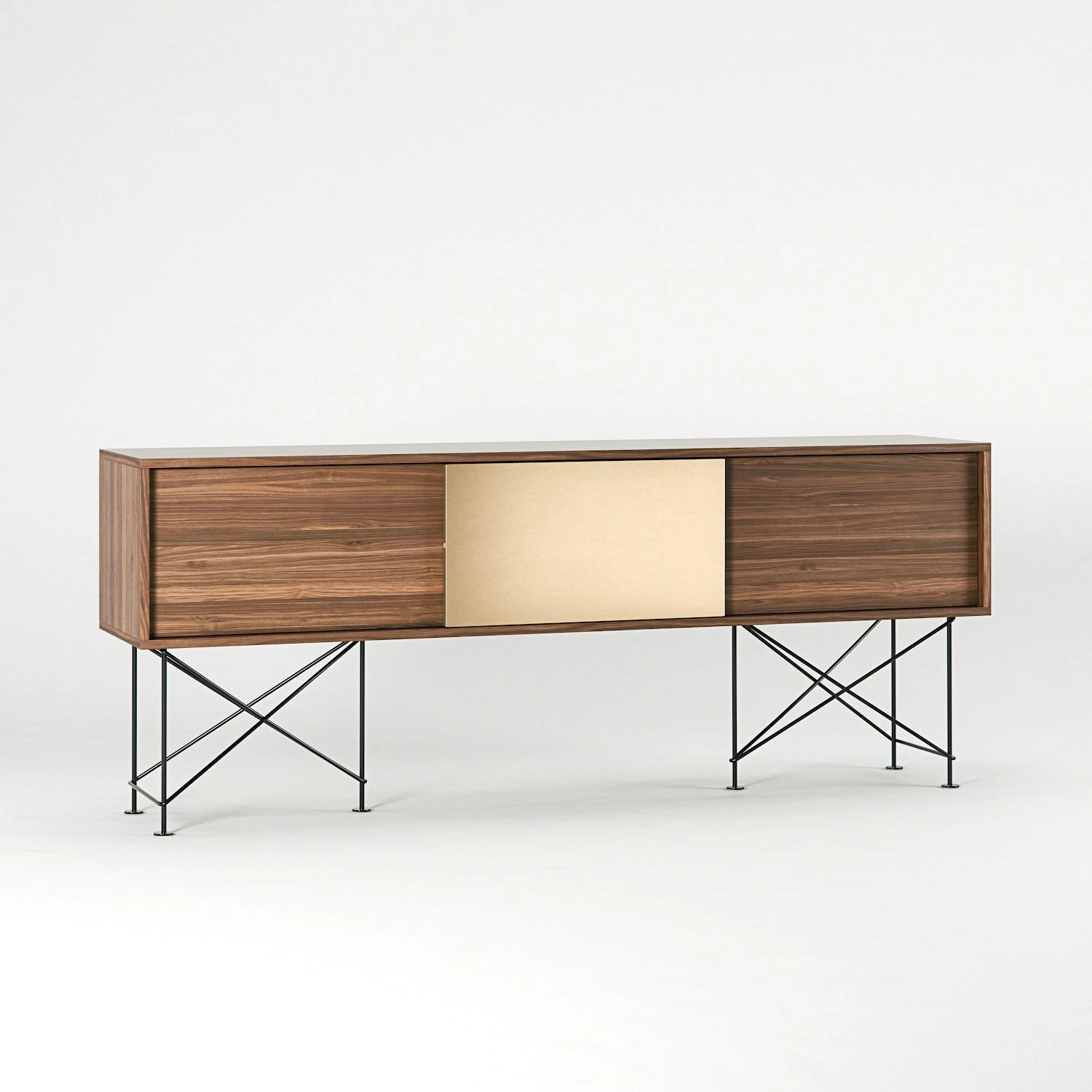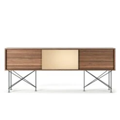 Das Sideboard ist in zwei verschiedenen Größen erhältlich: das kürzere ist 136cm lang und hat zwei Schiebetüren, das längere misst 180 cm und hat drei Schiebetüren. Die Ständer sind bei beiden Modellen 35cm hoch. Hinter jeder Schiebetüre befindet sich ein Fach mit einem Regal, welches für bestmöglichen Stauraum verstell- und herausnehmbar ist. Jedes Fach hat eine Öffnung auf der Rückseite, durch die Kabel gezogen und an der Hinterseite versteckt werden können. Die