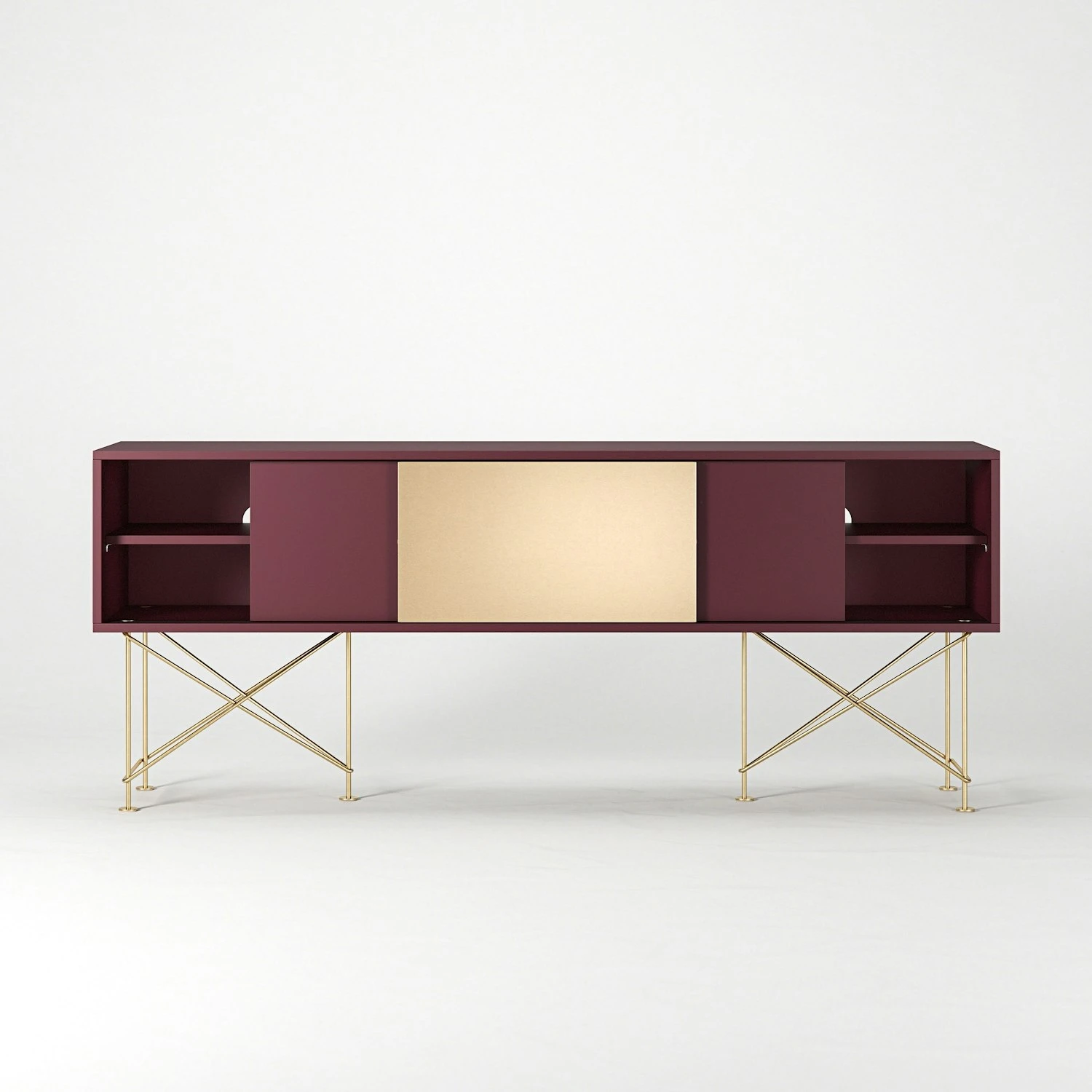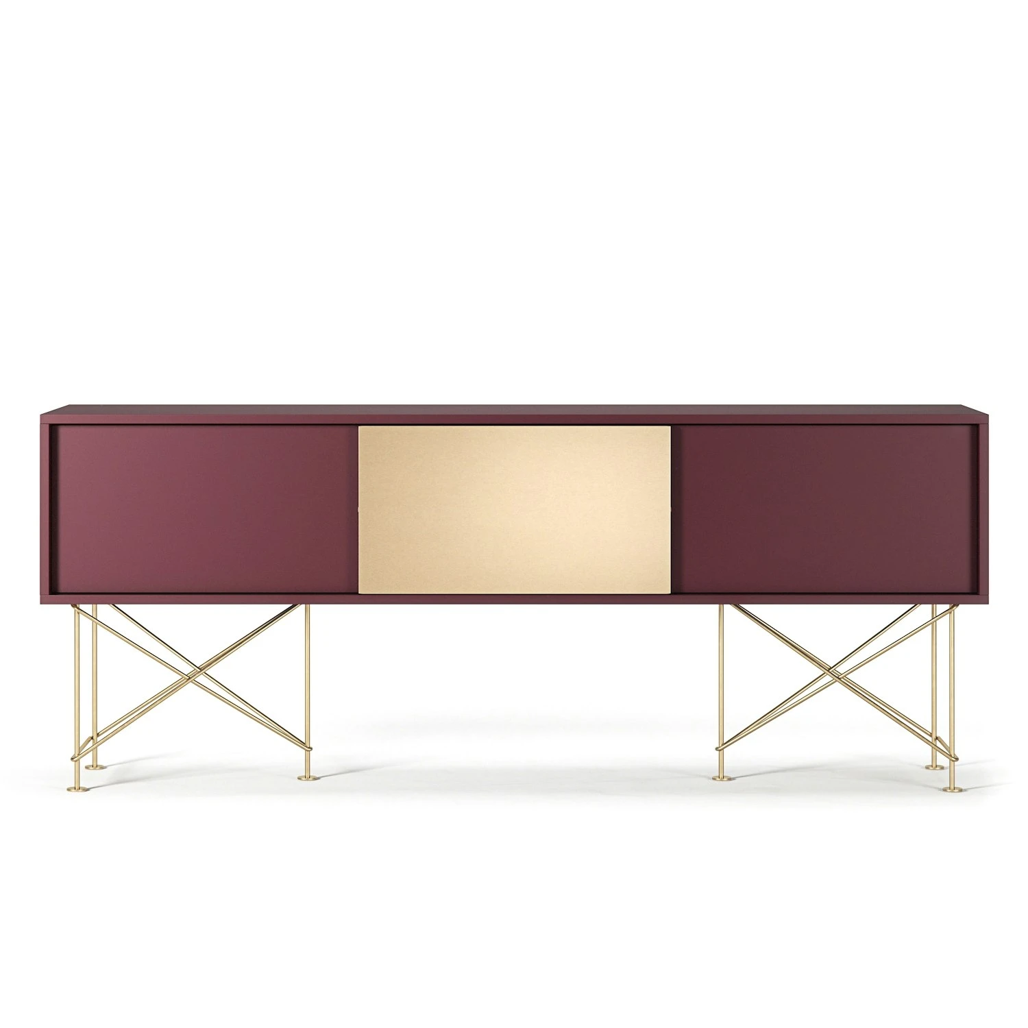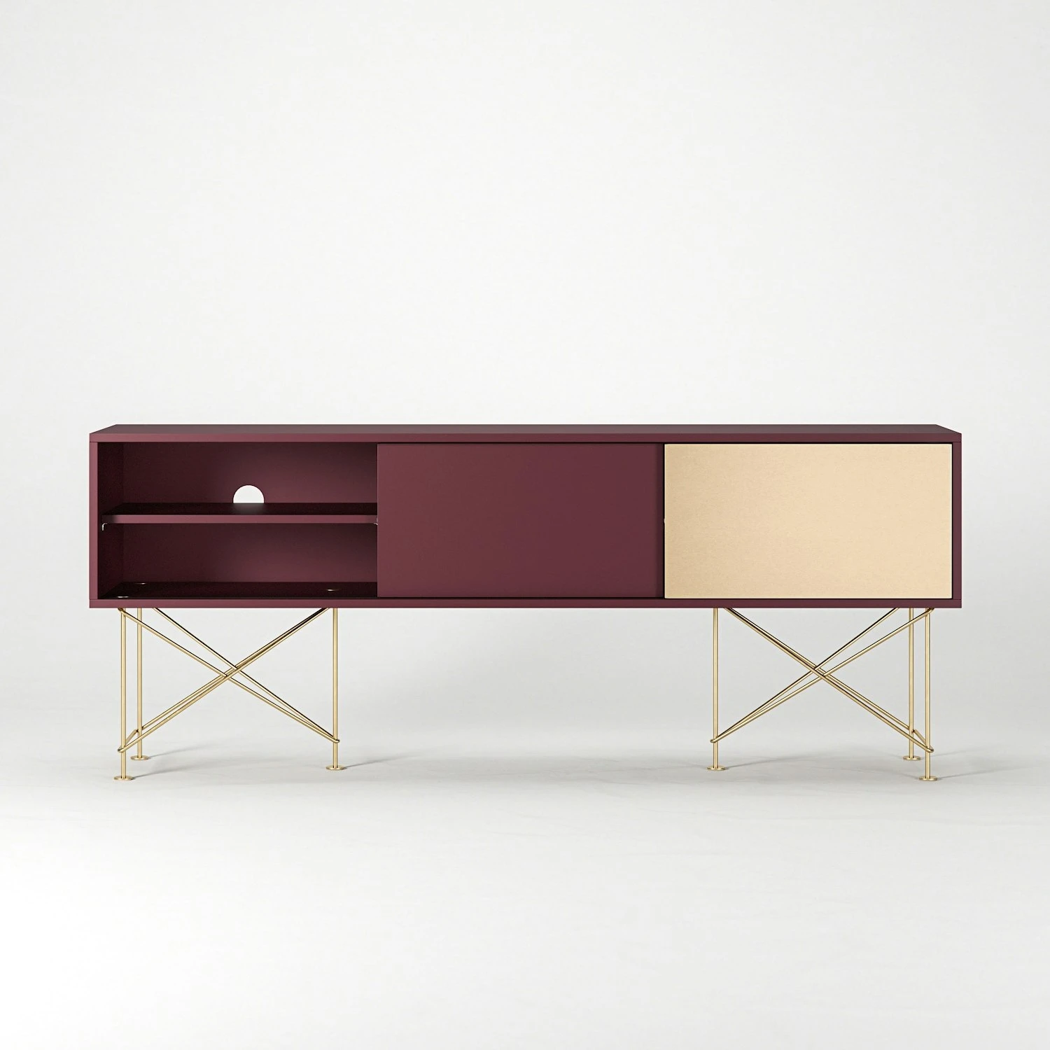 Das Sideboard ist in zwei verschiedenen Größen erhältlich: das kürzere ist 136cm lang und hat zwei Schiebetüren, das längere misst 180 cm und hat drei Schiebetüren. Die Ständer sind bei beiden Modellen 35cm hoch. Hinter jeder Schiebetüre befindet sich ein Fach mit einem Regal, welches für bestmöglichen Stauraum verstell- und herausnehmbar ist. Jedes Fach hat eine Öffnung auf der Rückseite, durch die Kabel gezogen und an der Hinterseite versteckt werden können. Die