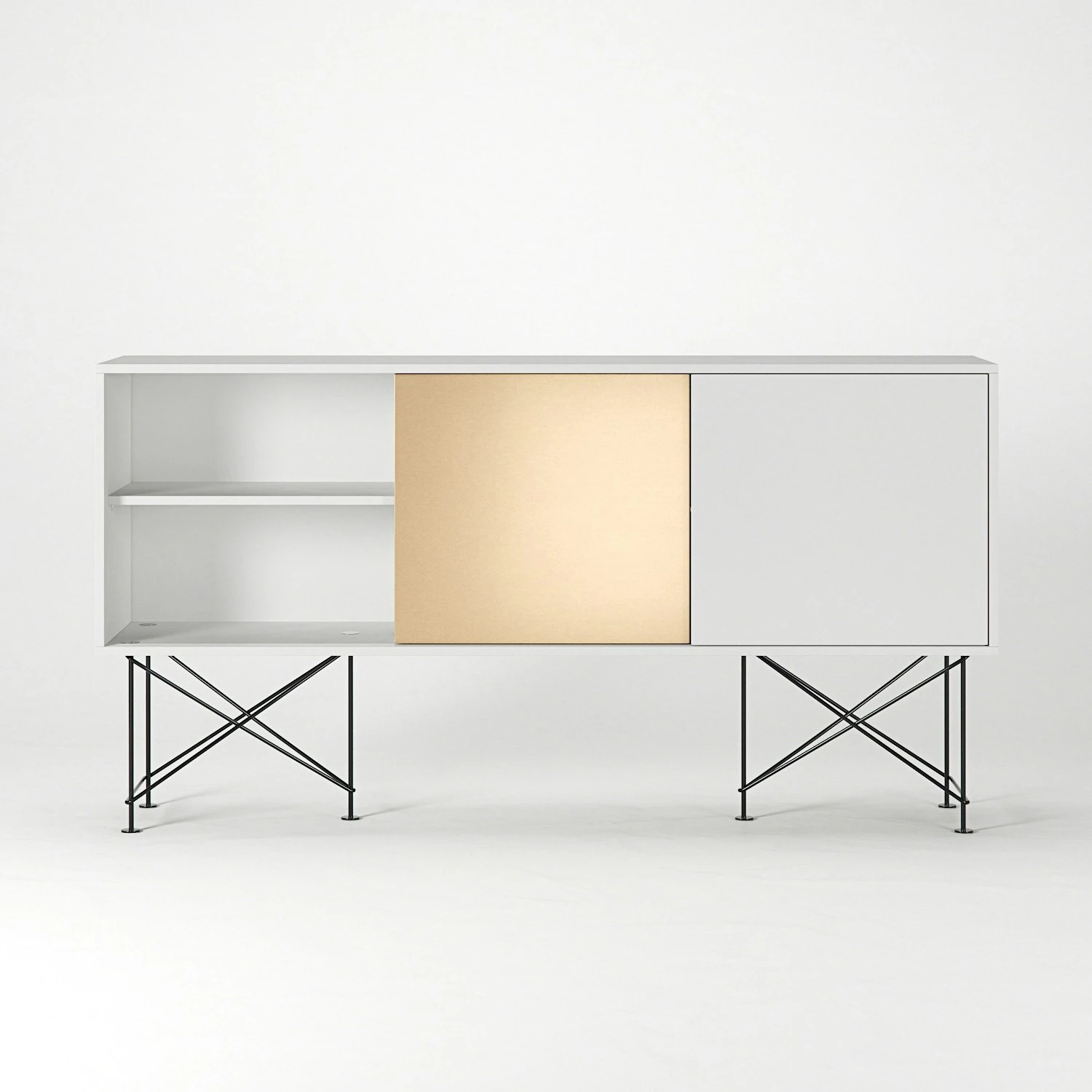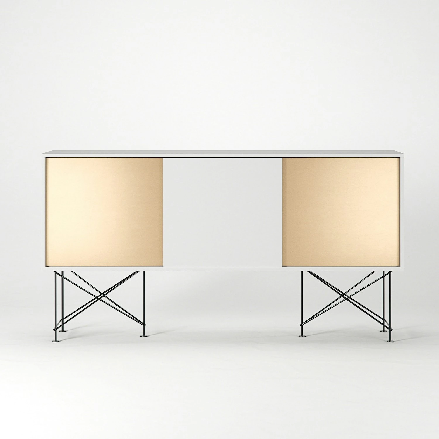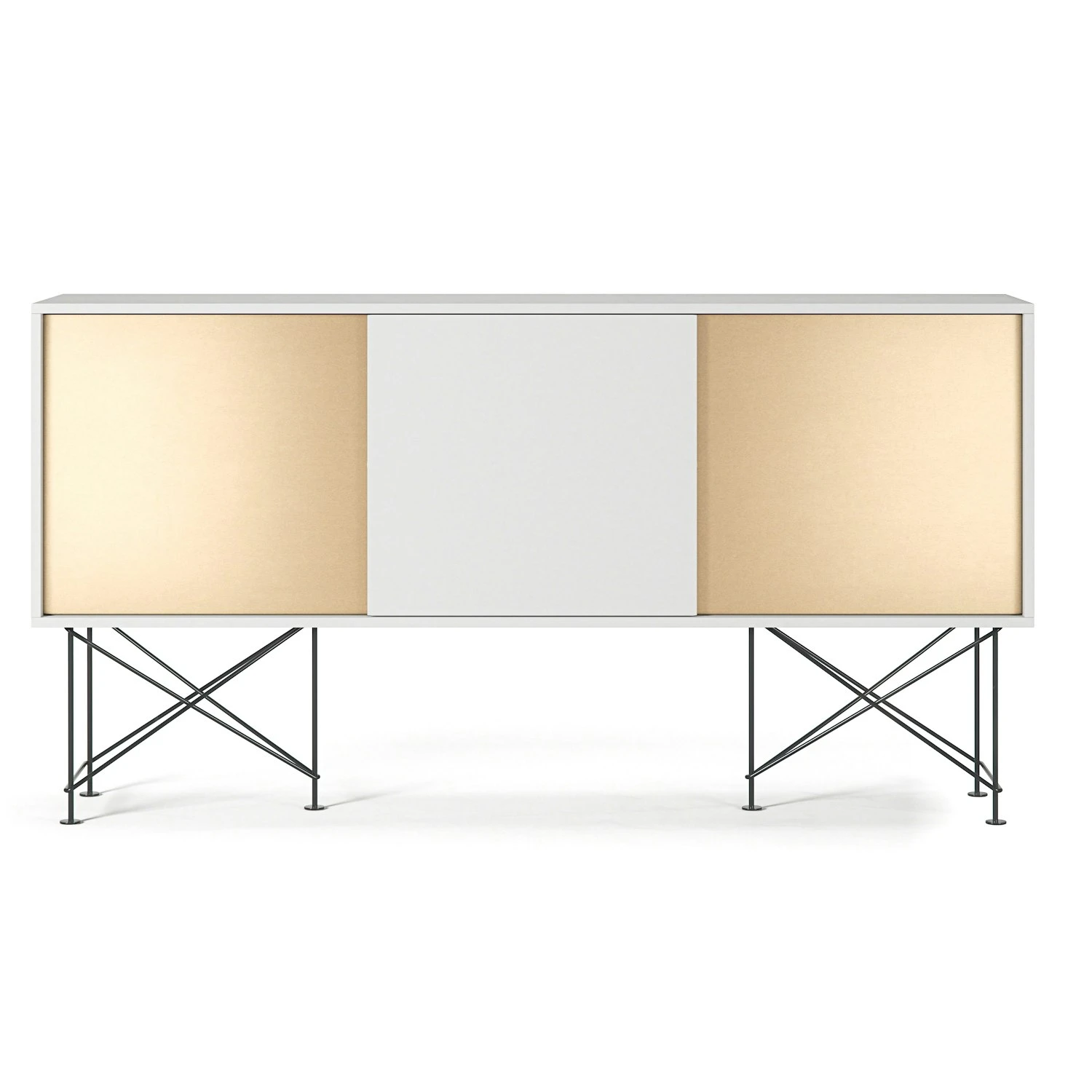 Vogue Sideboard von Decotique. Ein modernes und elegantes Sideboard im skandinavischen Design. Das Vogue Sideboard bietet zwei Funktionen im selben Möbelstück: praktischen Stauraum und Ablagefläche. Das Sideboard steht fest auf schönen Beinen aus Messing oder auf Beinen, die in drei verschiedenen Farben erhältlich sind. Wähle die Aluminiumversion mit Messingfront für ein besonders luxuriöses Gefühl. Im Inneren des Sideboards verbirgt sich ein verstellbares Regal.